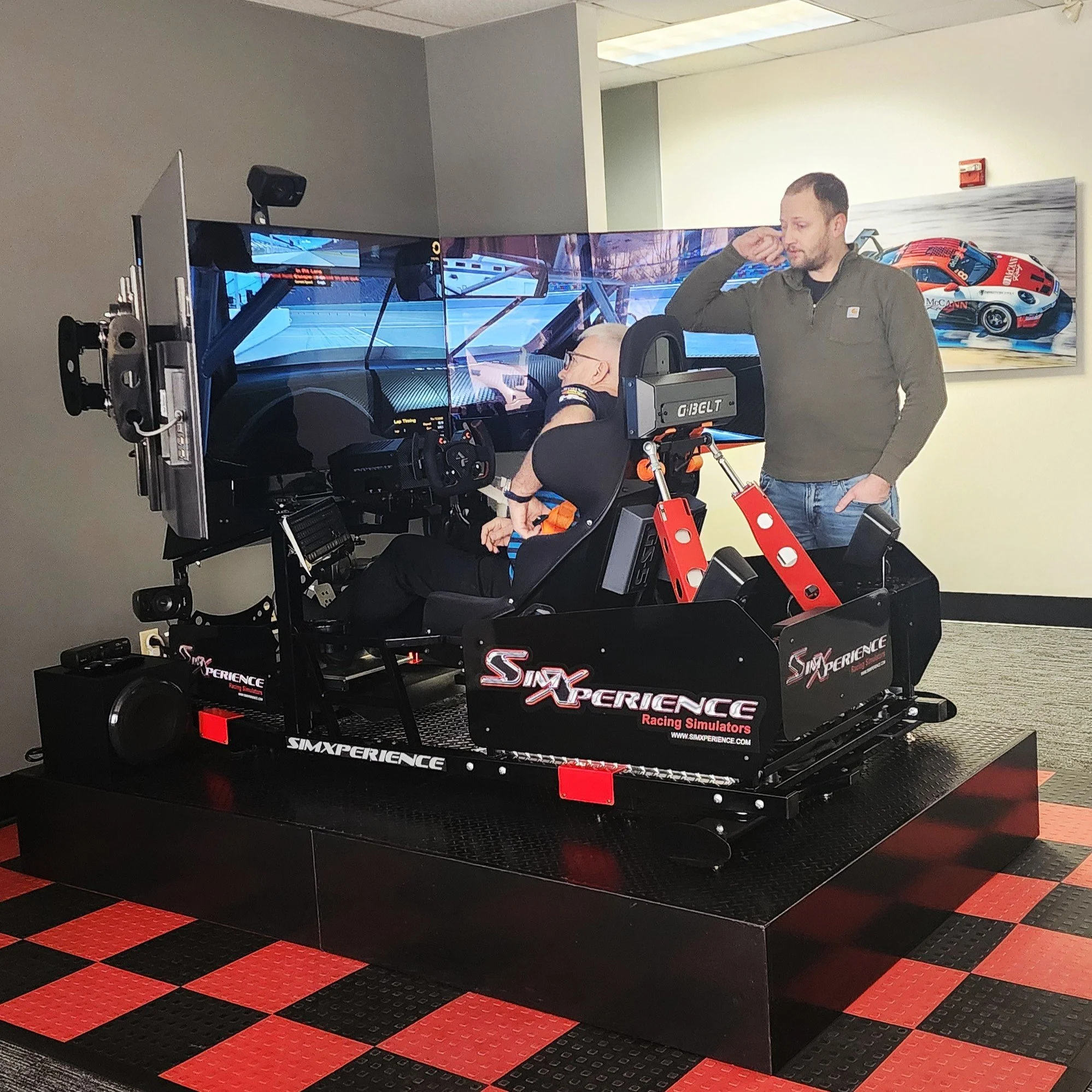 Customer using SimXperience stage 5 racing simulator at Track First's location Akron, Ohio