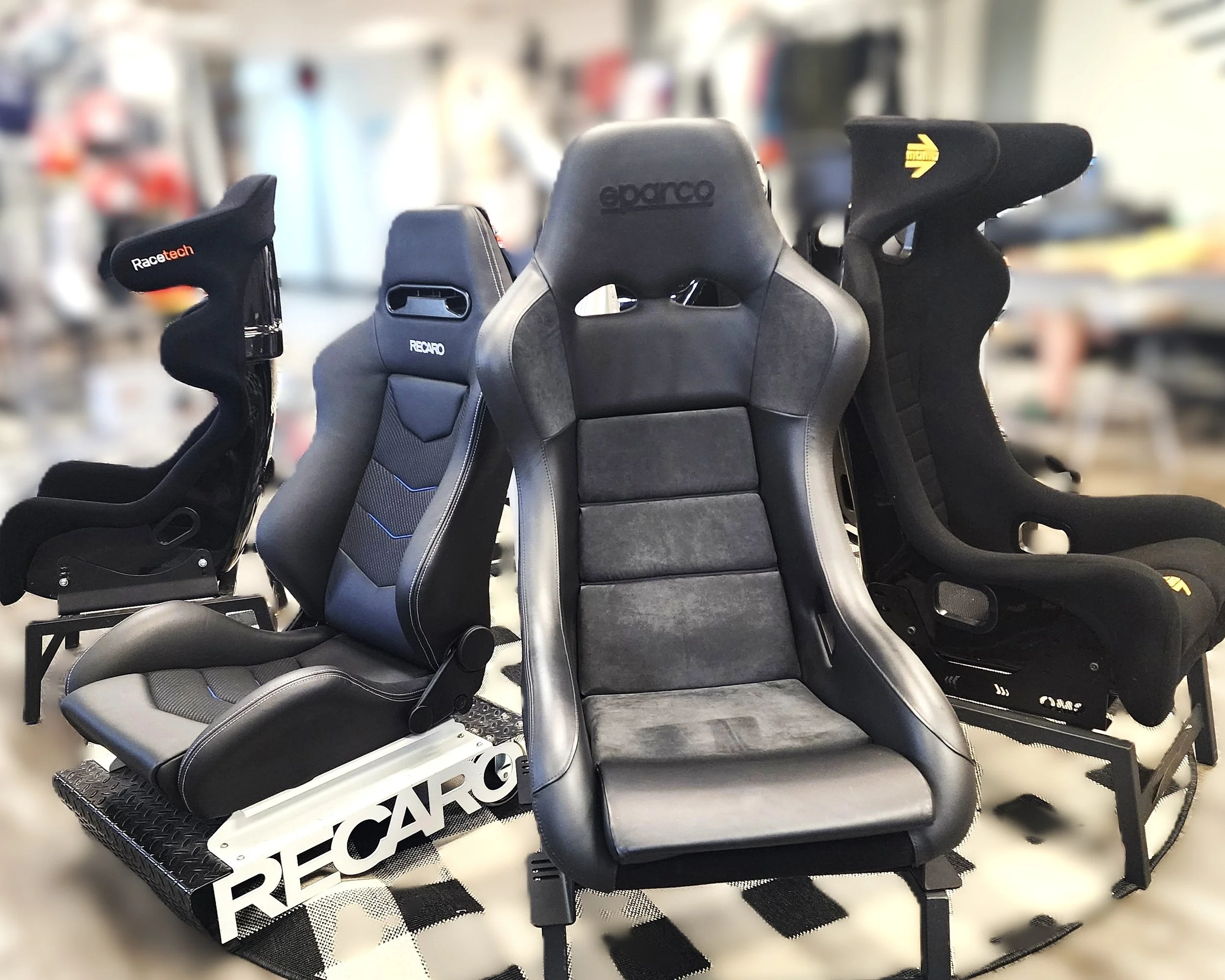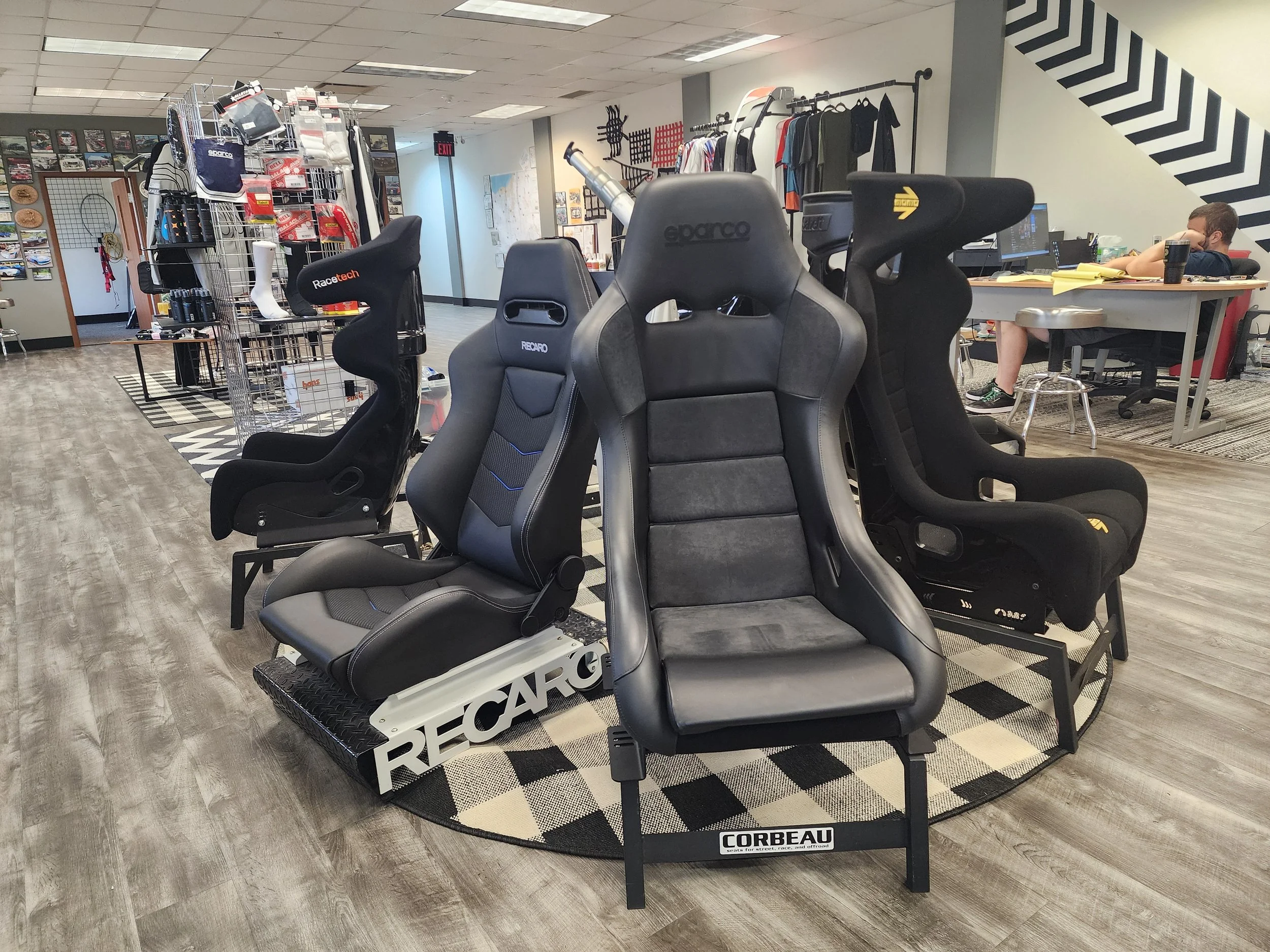 Four racing car seats on display in the Track First showroom Akron Ohio