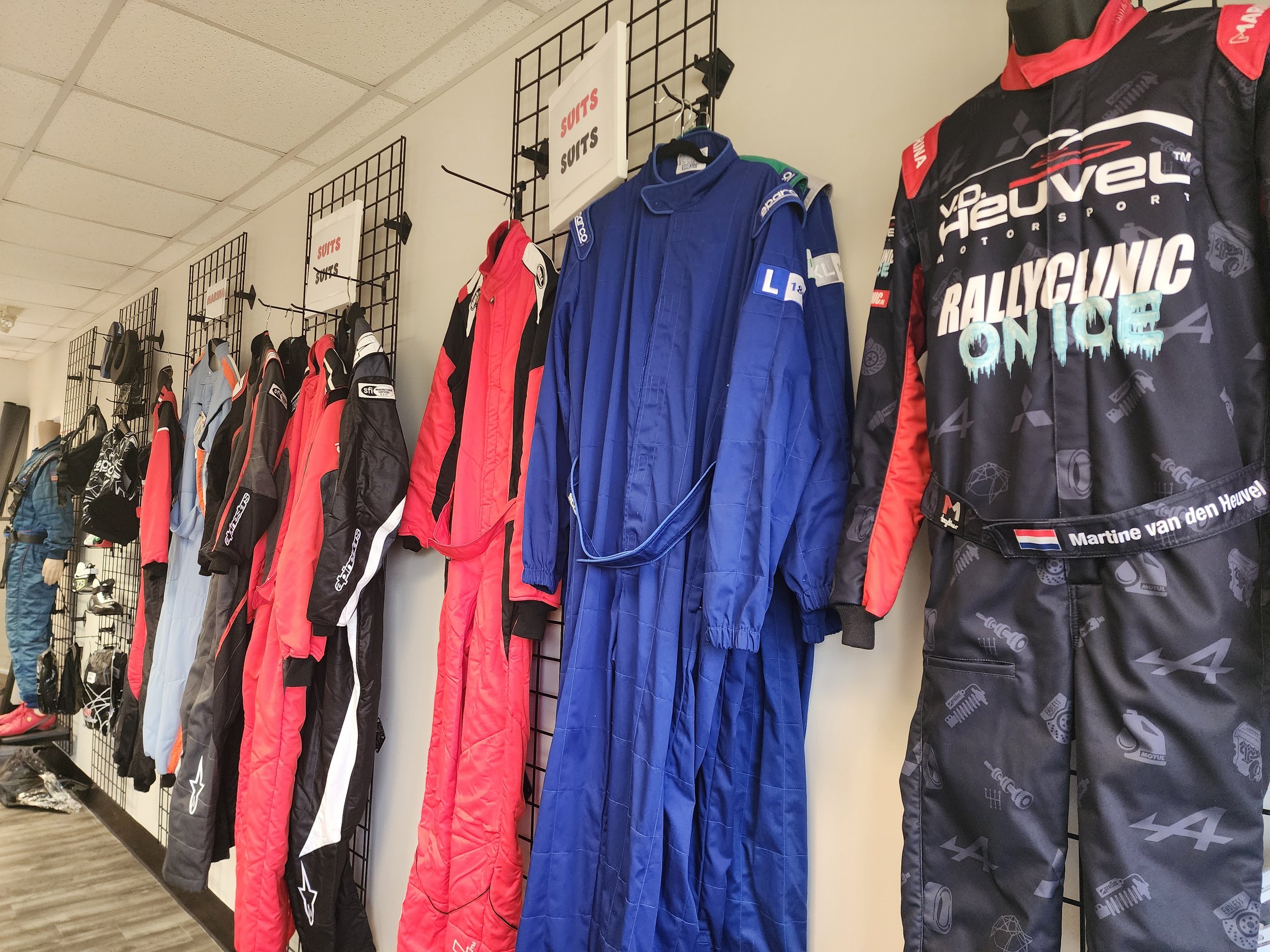 View inside Tack First Akron showroom with racing gear, car seats, and accessories on display