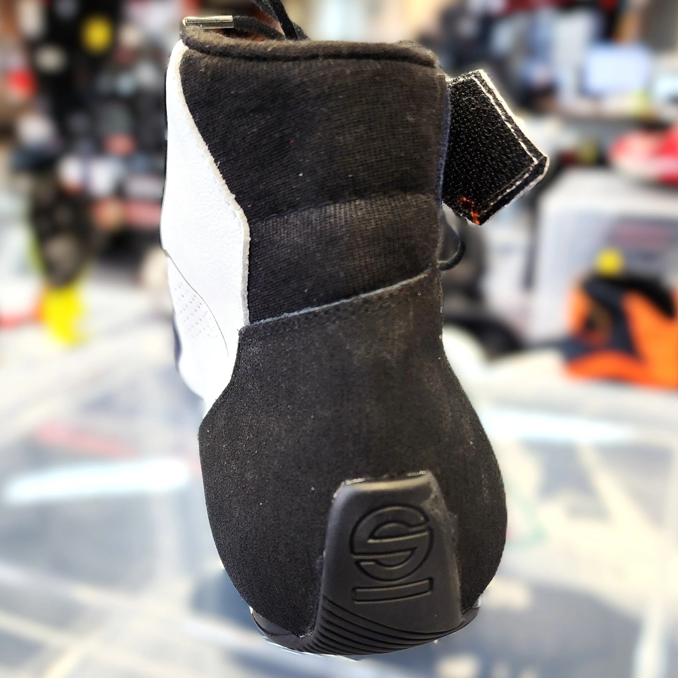 The HEELof a racing shoe heel will be rounded, enhanced and weighted to increase driver foot control and movement.