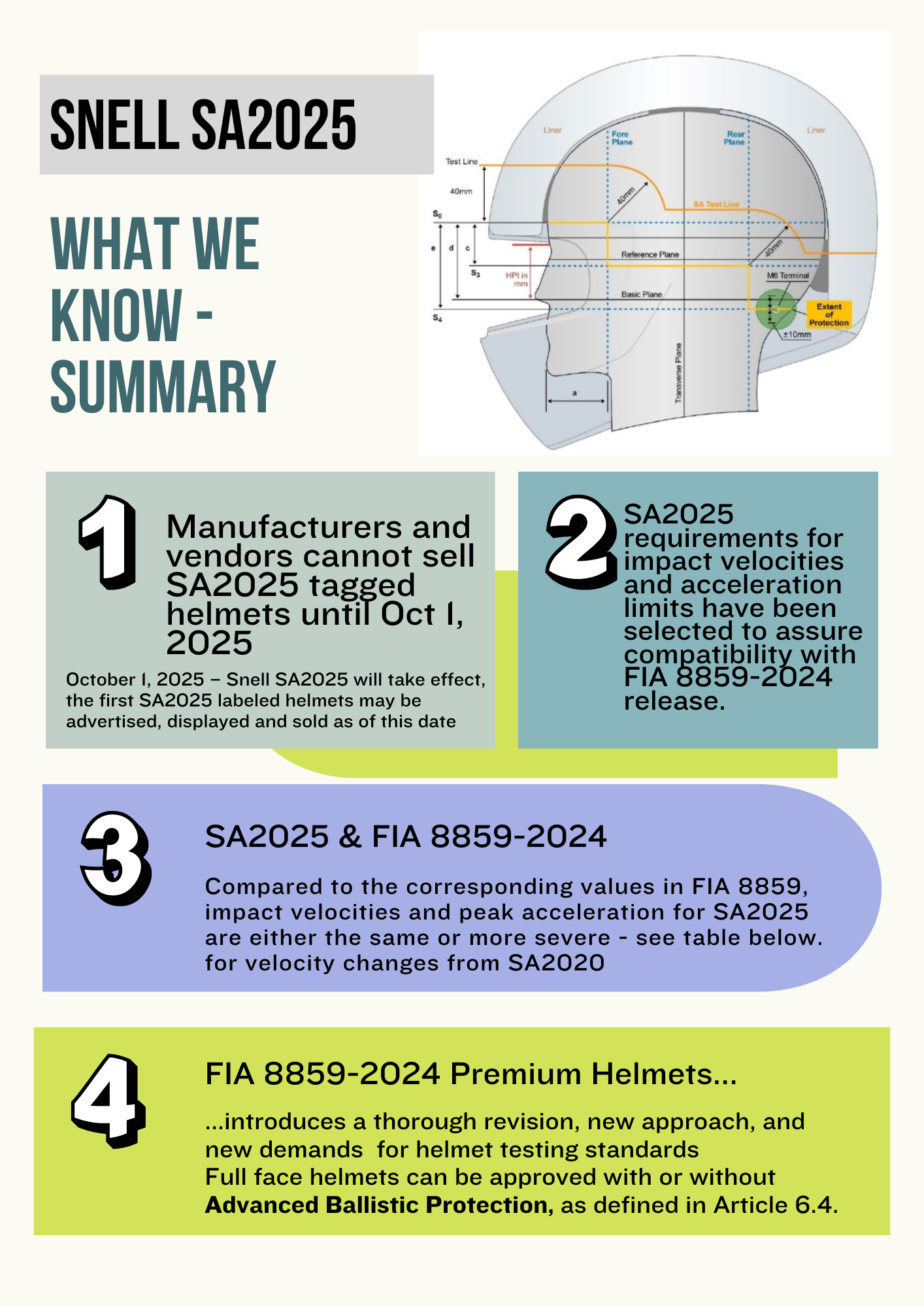 Infographic titled 'SNELL SA2025' summarizing key facts about helmet standards. It includes a diagram of a helmet shell with measurement labels, and four numbered sections: 1) Manufacturers cannot sell SA2025 helmets until October 1, 2025; 2) SA2025 requirements for impact velocities and acceleration limits; 3) Comparison between SA2025 and FIA 8859-2024 impact values; 4) Description of FIA 8859-2024 premium helmets and their features for testing standards.